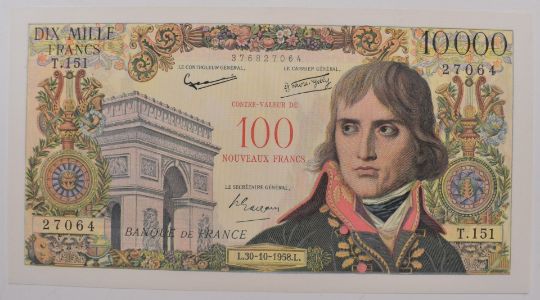Banque de France 100 new francs on 10,000 francs, 1955 type 31 Oct 1958, serial number  T 151 27064. Mint uncirculated condition with earlier Spink  sales details (and estimated at £500-600