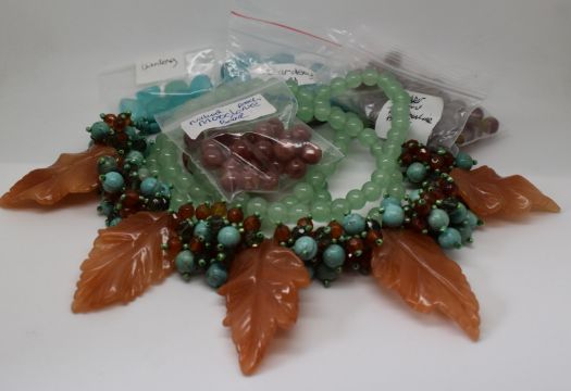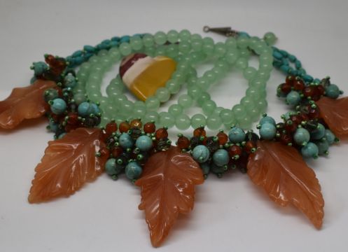 A beaded turquoise and carnelian agate necklace with carved leaves, chalcedony agate, watermelon tourmaline beads, quartz beads, etc