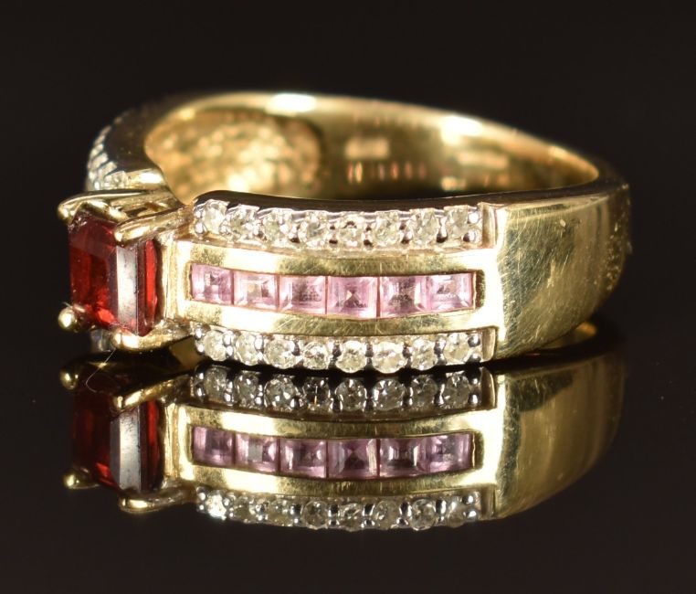 A 9k gold ring set with a garnet, pink sapphires and diamonds, size M, 4.2g