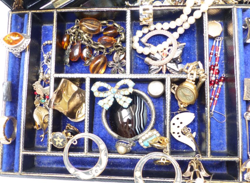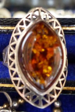 A collection of costume jewellery including paste, silver ring set with pressed amber, Toledo earrings, faux pearls etc