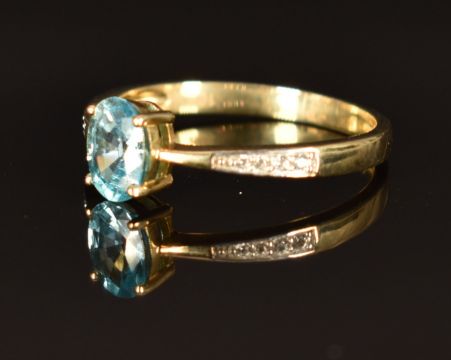 A 9ct gold ring with an oval sapphire and white sapphires, size P, 2g