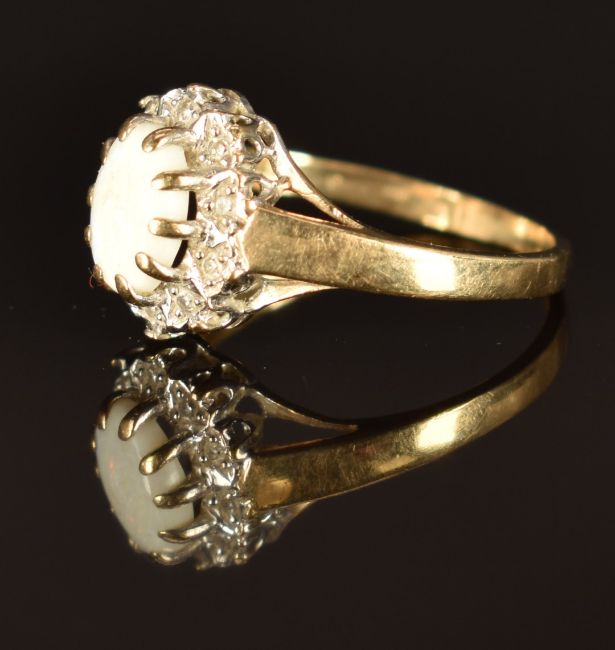 A 9ct gold ring set with an opal surrounded by diamonds, size K, 1.5g