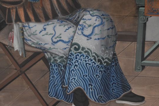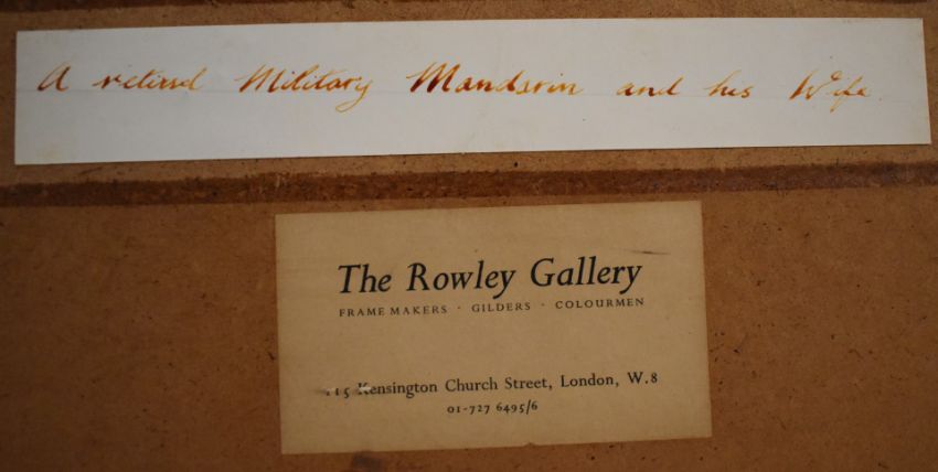 Large 19th/20thC Chinese watercolour of a couple with opium pipes, entitled verso 'A retired military Mandarin and his wife', 46 x 59cm
