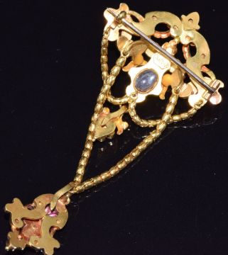 Victorian yellow metal brooch set with turquoise cabochons, verso a small glass compartment set with plaited hair, maker's mark MH, 12g, in original fitted box