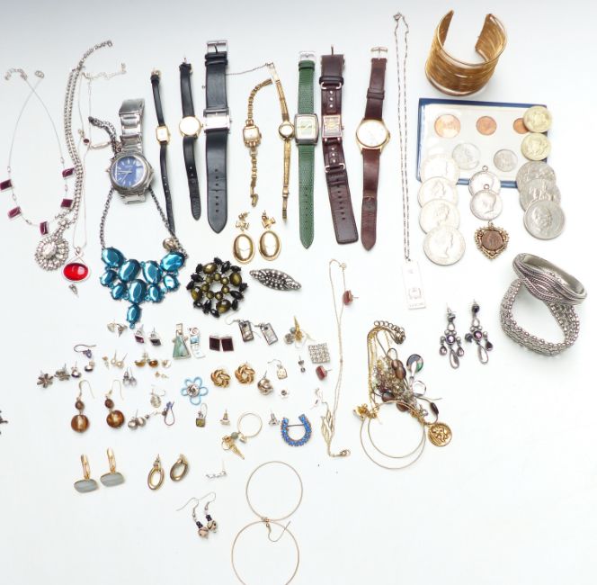 A collection of costume jewellery, coins and watches, including silver bracelet, silver necklace, silver earrings, silver ingot, 9ct gold necklace and earrings (1.9g), etc
