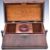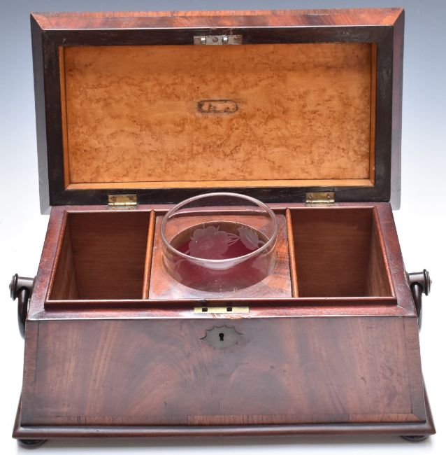Late Regency William IV flame mahogany and rosewood sarcophagus tea caddy with ring handles and bun feet. The interior with burr maple and etched glass mixing bowl, W34 x D19 x H19cm