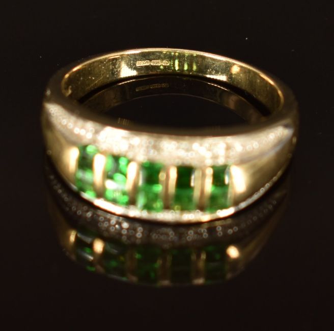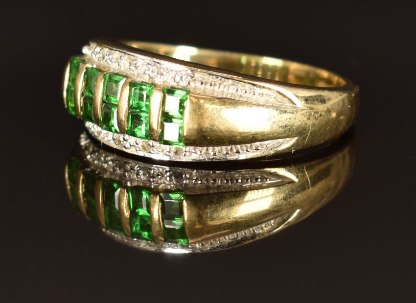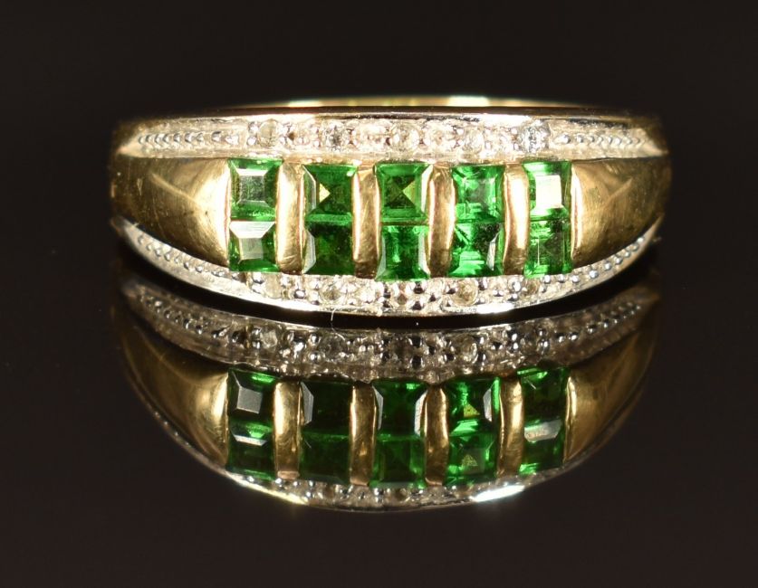 A 9k gold ring set with tsavorite garnets and zircon, size N, 3.8g