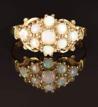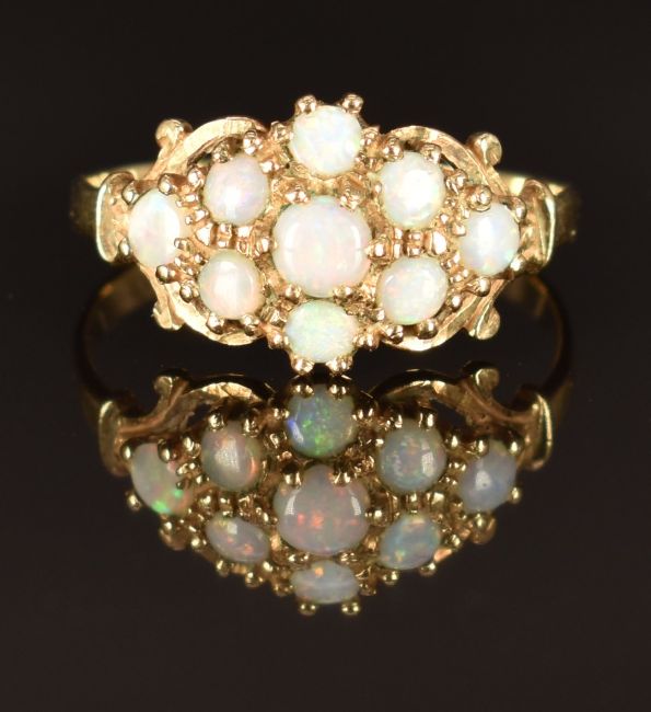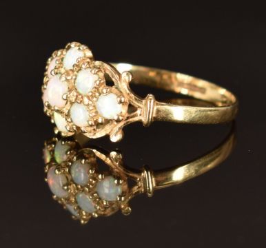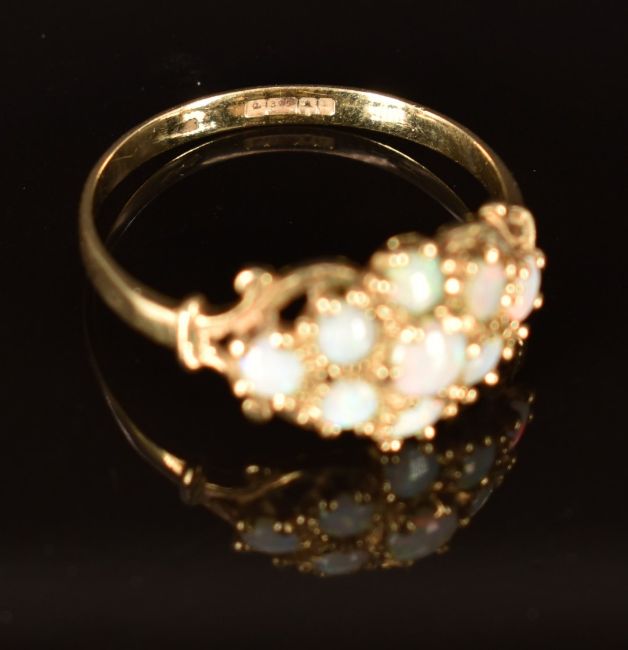A 9ct gold ring set with opals in a cluster, size P, 2g
