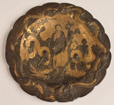 Japanese metal charger with decoration in relief of a religious or court scene with monks, within a  dragon surround, diameter 26cm