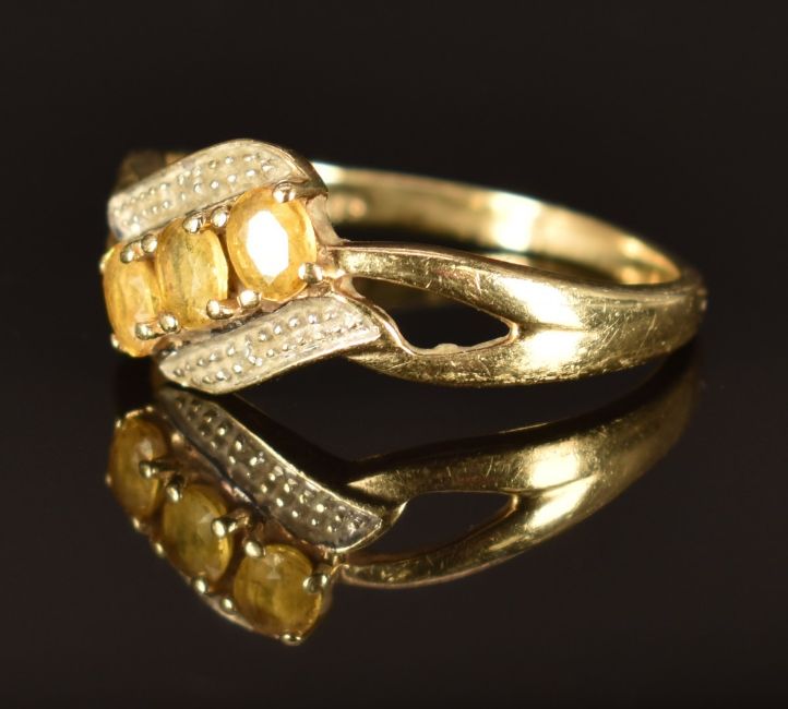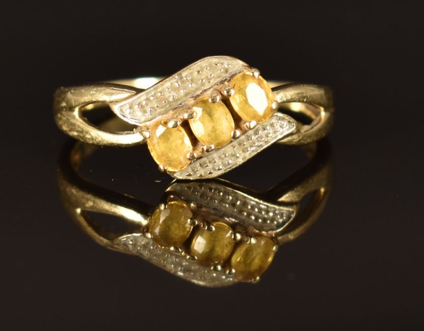 A 9ct gold ring set with three citrines, size Q, 2.3g