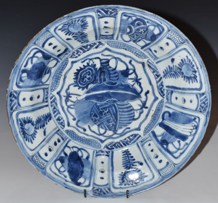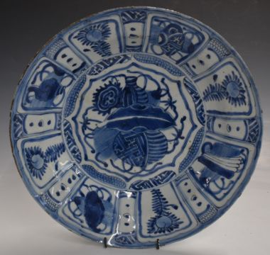 An 18thC or earlier Chinese blue and white dish decorated with flowers and auspicious symbols, diameter 31.5cm