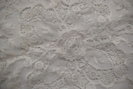 A 19thC carved bone and lace fan and a circular piece of lace, L22.5cm