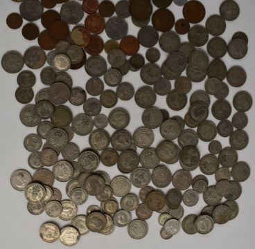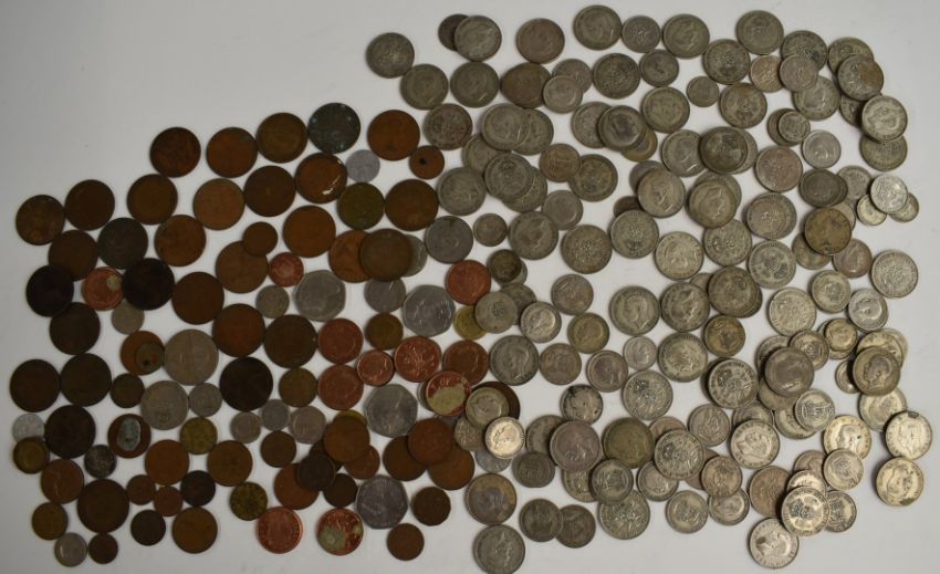 Approximately 1240g of UK pre 1947 silver coinage, together with a further quantity of UK and overseas coinage