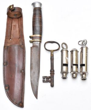 Bakelite semicircular stationery / desk tidy box with revolving compartment and white metal monogram, two velvet covered clock or statue bases, sheath knife, whistles, two lead figural finials, etc