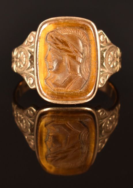A 9ct gold ring set with a tiger's eye cameo, size T, 5.3g