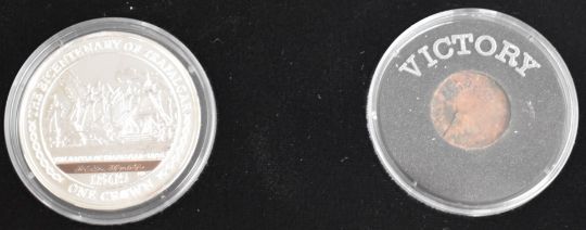 London Mint Office Piedfort silver/gold plated £5 coin in deluxe case together with a further gold plated silver example with jewels and a Pobjoy Mint HMS Victory souvenir coin