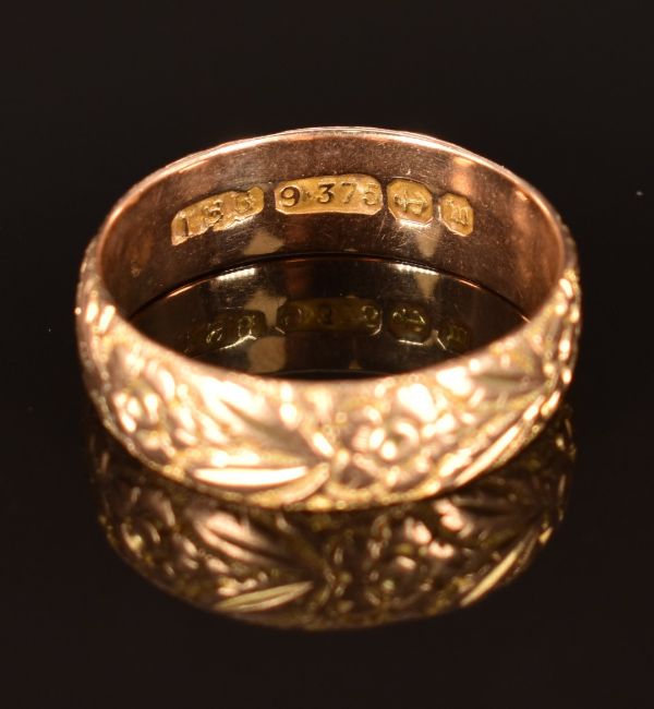 Victorian 9ct gold engraved ring/band, Birmingham 1896, size Q/R, 3.3g