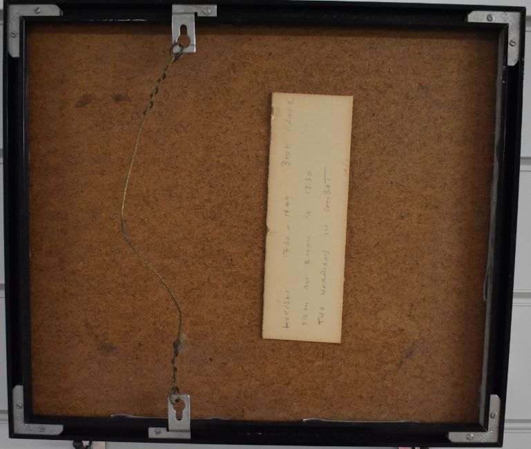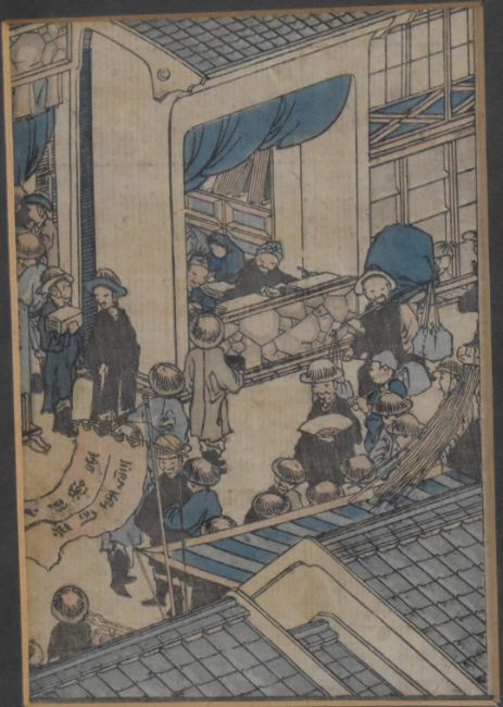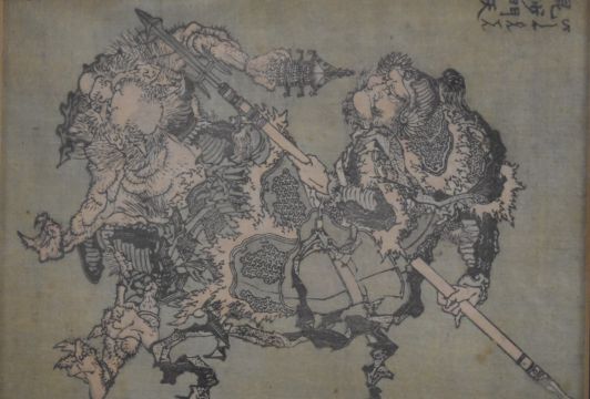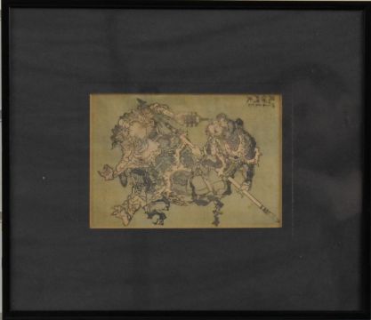 Five Japanese prints including including warriors in combat, in three frames, largest 18 x 13cm