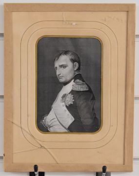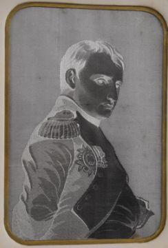 19thC two sided stevengraph or similar needlework picture in silk of Napoleon Bonaparte. 16 x 10cm, 27 x 21cm overall