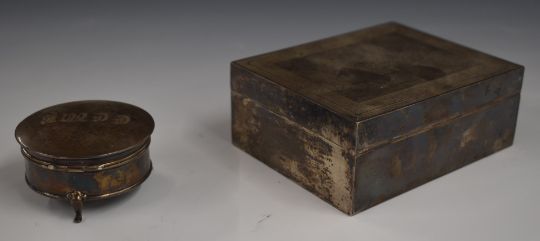 Hallmarked silver cigarette box with engine turned decoration, width 11.5cm, together with a hallmarked silver dressing table casket, Birmingham 1922, maker Henry Clifford Davis, diameter 6cm