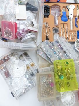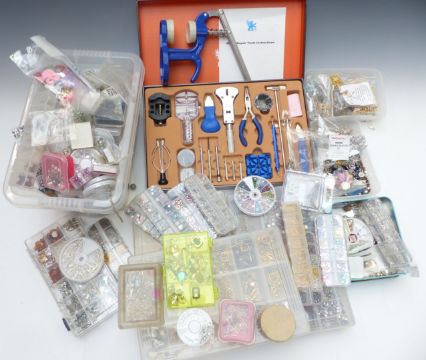 A collection of costume jewellery, jewellery repair items, watch repair tools, etc