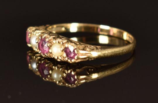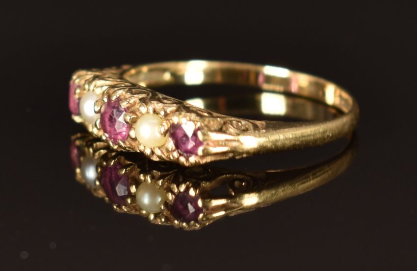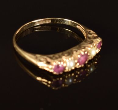 A 9ct gold ring set with pearls and rubies, size M, 1.6g