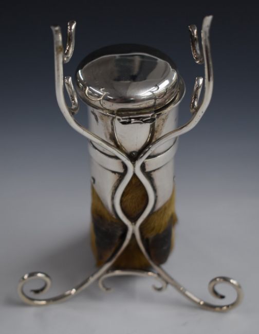 George V hallmarked silver mounted deer slot inkwell and pen stand, London 1914, maker Henry Williamson Ltd, height 15.5cm