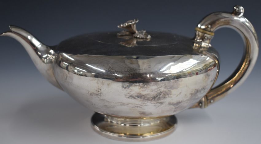 William IV hallmarked silver teapot of plain squat form, London 1830, maker James Charles Edington, length 25cm, weight 631g all in