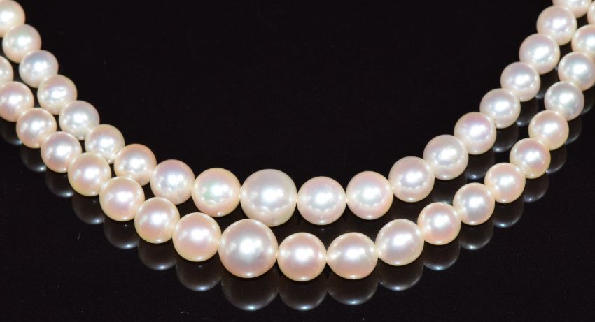 A double strand cultured pearl necklace with 9ct gold clasp set with an amethyst and pearls