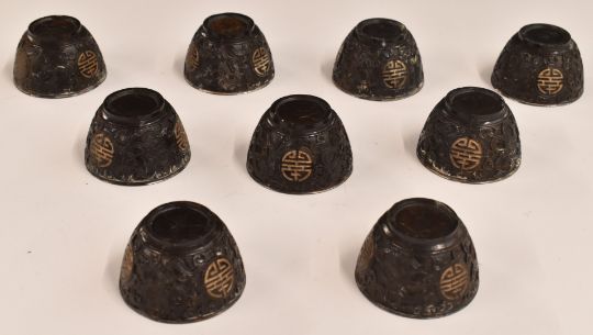 Set of nine late 19th/ early 20thC Chinese carved coconut shell or similar silver lined wine cups with character marks to interior, H3cm, diameter 5cm