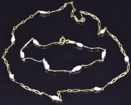 A 9ct gold necklace set with pearls and a similar bracelet, 4.9g