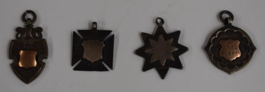 Four hallmarked silver watch chain fobs, various shapes including shield, Maltese Cross, eight point star and decorative oval. Two with gold centres, one with Chester hallmark, one in Vaughan & Whitehouse Cinderford box, weight of all four 29g