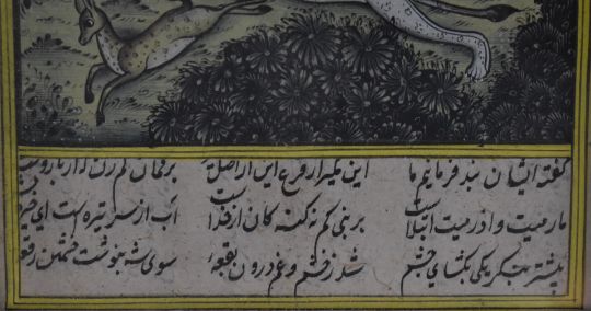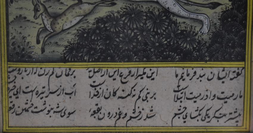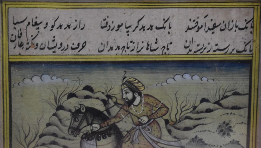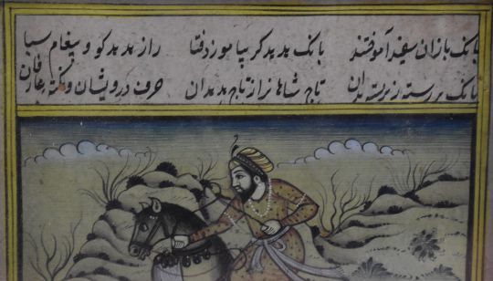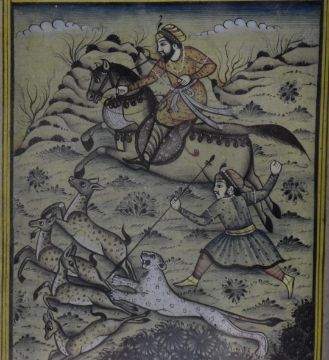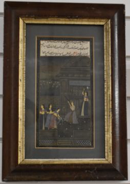 Three Persian watercolours comprising court scenes, lovers embracing and a hunting scene, largest 24 x 13cm