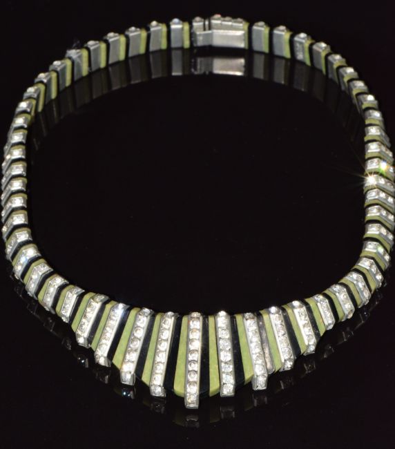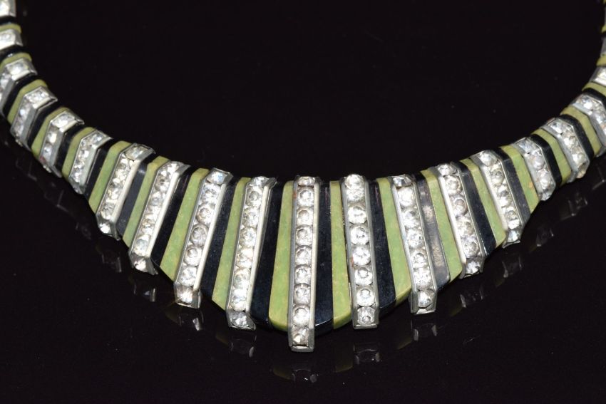 Art Deco green and black Bakelite necklace set with paste