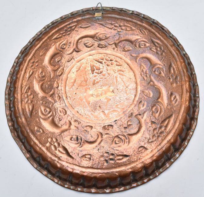Arts and Crafts copper charger in the Newlyn style, hand worked with hammered decoration of fish and swags around a central image, diameter 31cm