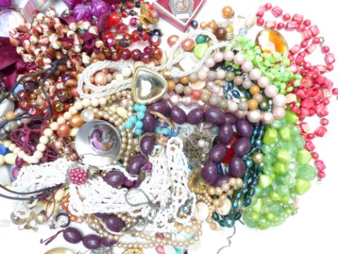 A collection of costume jewellery including vintage beads, spider brooch, Sarah Coventry brooch, Sphinx brooch, etc