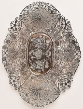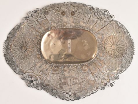 Chinese silver filigree dish with character marks to base, length 20cm, weight 126g
