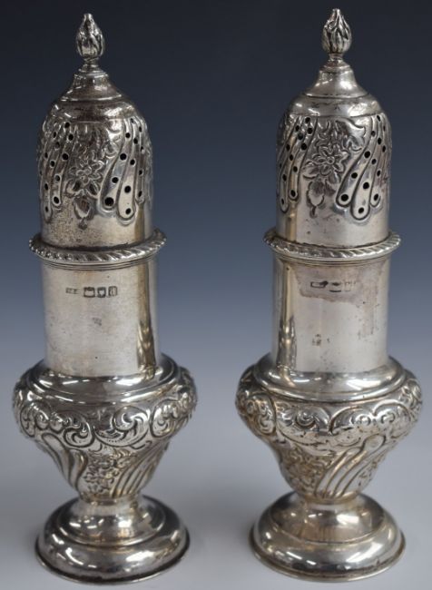 Victorian pair of hallmarked silver sugar casters with embossed decoration, London 1899, maker Matthew John Jessop, height 19cm, weight 327g all in