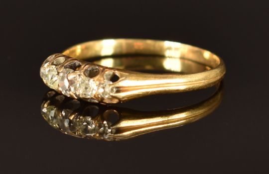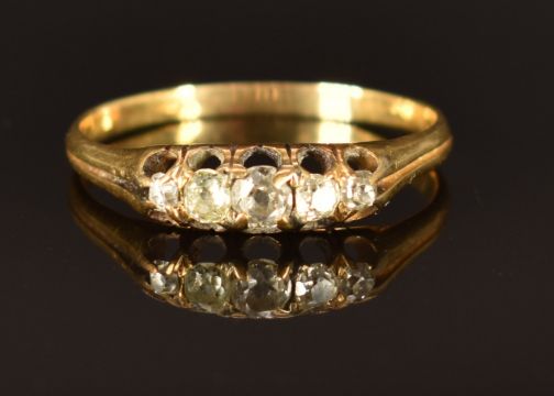An 18ct gold ring set with five old cut diamonds, size P, 2.3g