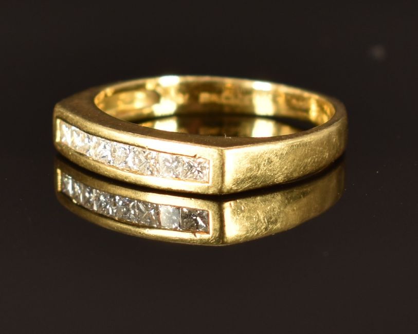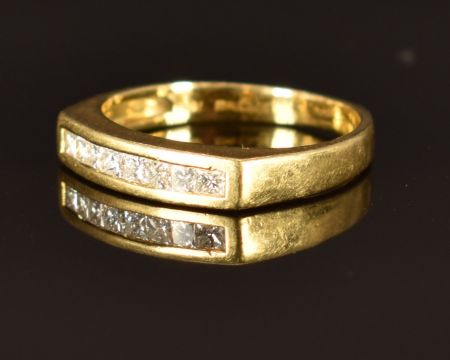 An 18ct gold ring set with eight princess cut diamonds, size J, 2.7g