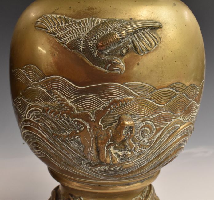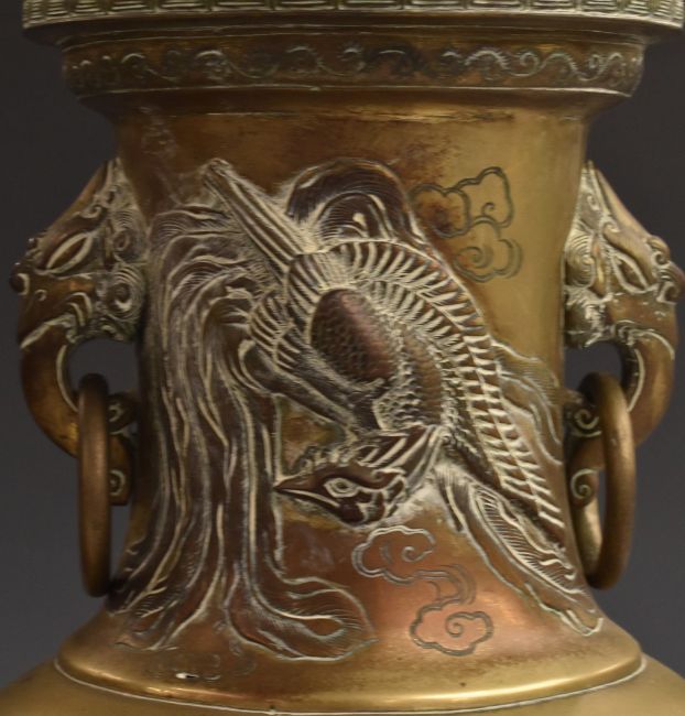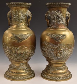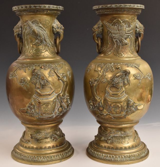 A pair of Chinese brass vases with relief moulded decoration and ring handles, H45cm