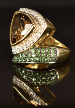 A 9k gold ring set with smoky quartz, tsavorite garnets and diamonds, size M, 11g