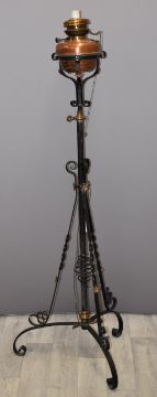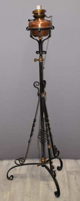 In the manner of WAS Benson Victorian wrought iron and copper extending oil lamp, H152cm