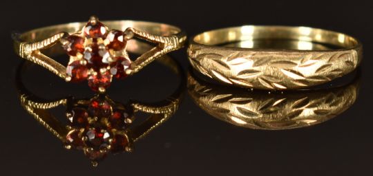A 9ct gold ring set with garnets (size U, 1.2g) and a 9ct gold ring, size U, 1.6g