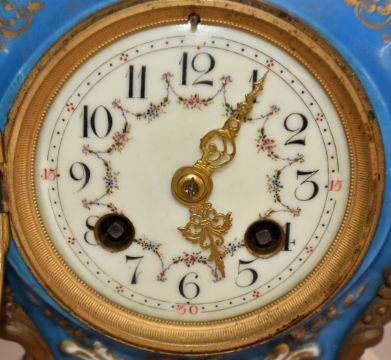 19thC French mantel clock in champlevé enamel case with ormolu mounts, decorated with putto and musical instruments, the two train movement by Vincenti striking on a gong, the ivory coloured Arabic dial painted with swags with gilt filigree hands, H30cm