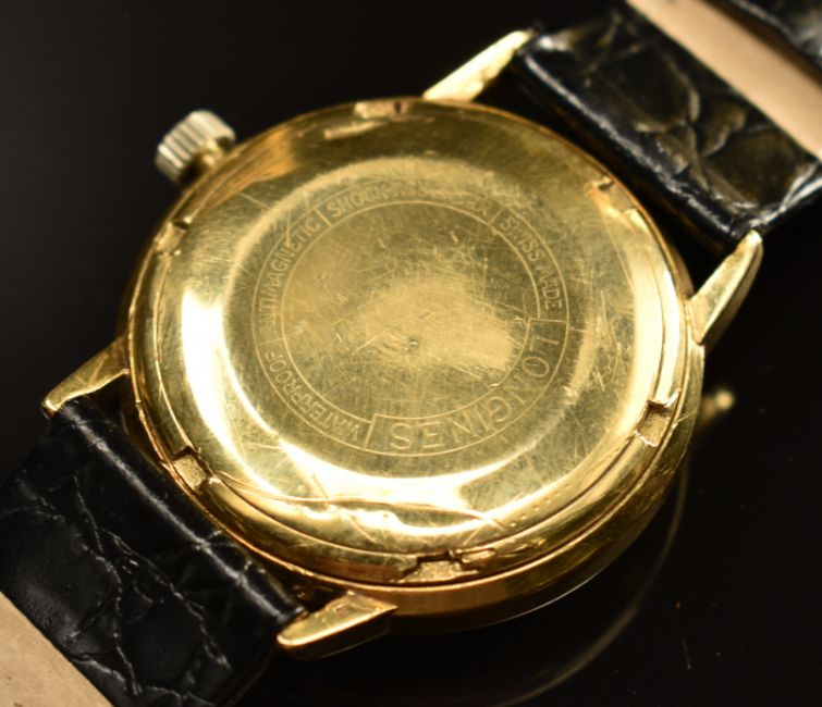 Longines Conquest 18ct gold gentleman's automatic wristwatch ref. 7008 7 with date aperture, gold hands and hour markers, silver dial and signed 24 jewel calibre 291 movement, on black leather strap, case diameter 35mm, serial number 11260383.