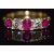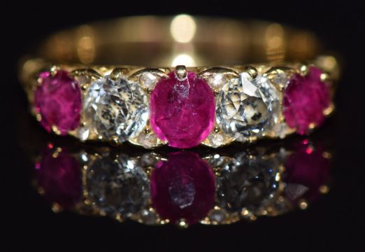 A c1900 18ct gold ring set with cushion cut rubies and old cut diamonds in a scrolling setting, total diamond weight approximately 0.7cts, size P, 4.7g