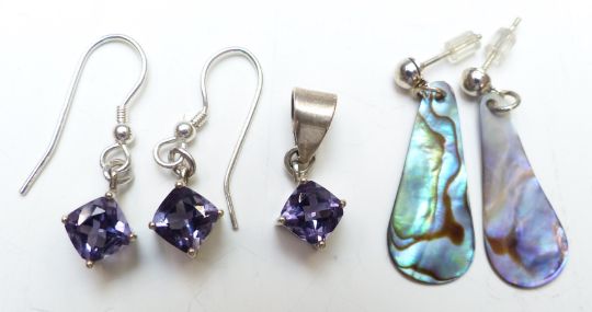 A collection of costume jewellery including a silver brooch set with malachite, silver earrings, etc in a Stackers jewellery box