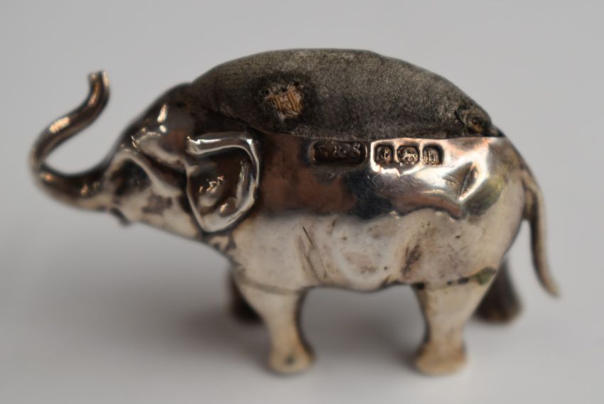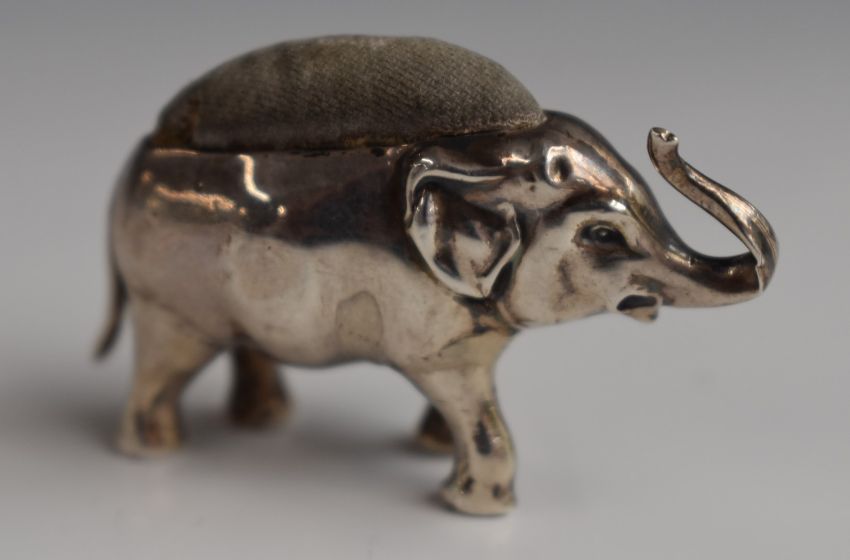 Edward VII hallmarked silver novelty pin cushion in the form of an elephant with raised trunk, Birmingham 1907, maker Levi and Salaman, length 4.5cm