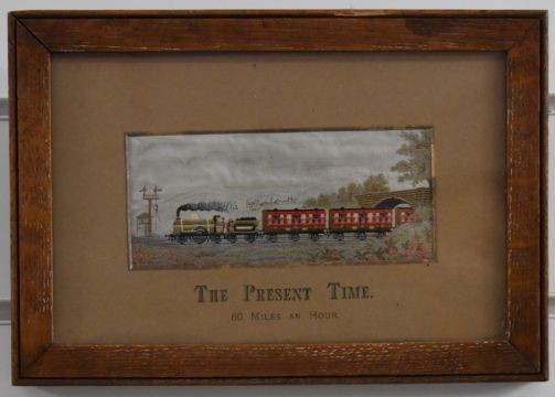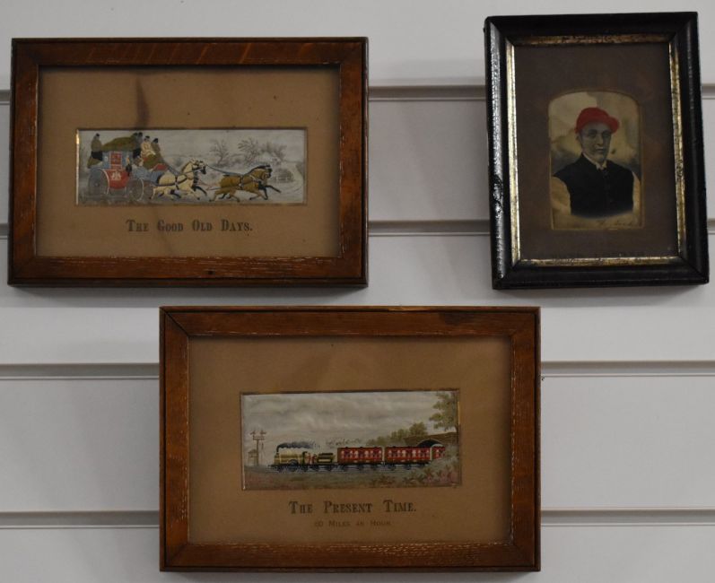 Three framed silk Stevengraph or similar silk pictures, comprising The Good Old Days (coach and horses), The Present Time (railway locomotive with train) and Fred Archer (jockey) horse racing / equestrian interest, overall size of largest 17 x 24cm